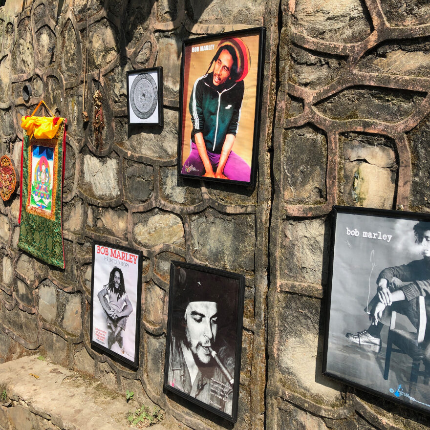 - On my way down from the Temple, a photo display on the wall of Bob Marley (and Che)