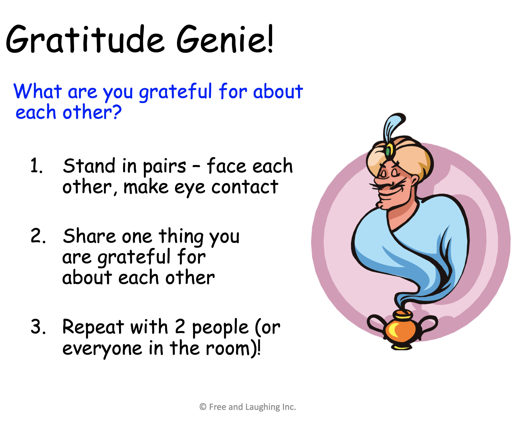 I now include Gratitude in my workshops. I love watching my clients do this particular exercise. It really brings me joy when I feel the energy of the participants soar! Try it at your next meeting – and see why I call it “Gratitude Genie”